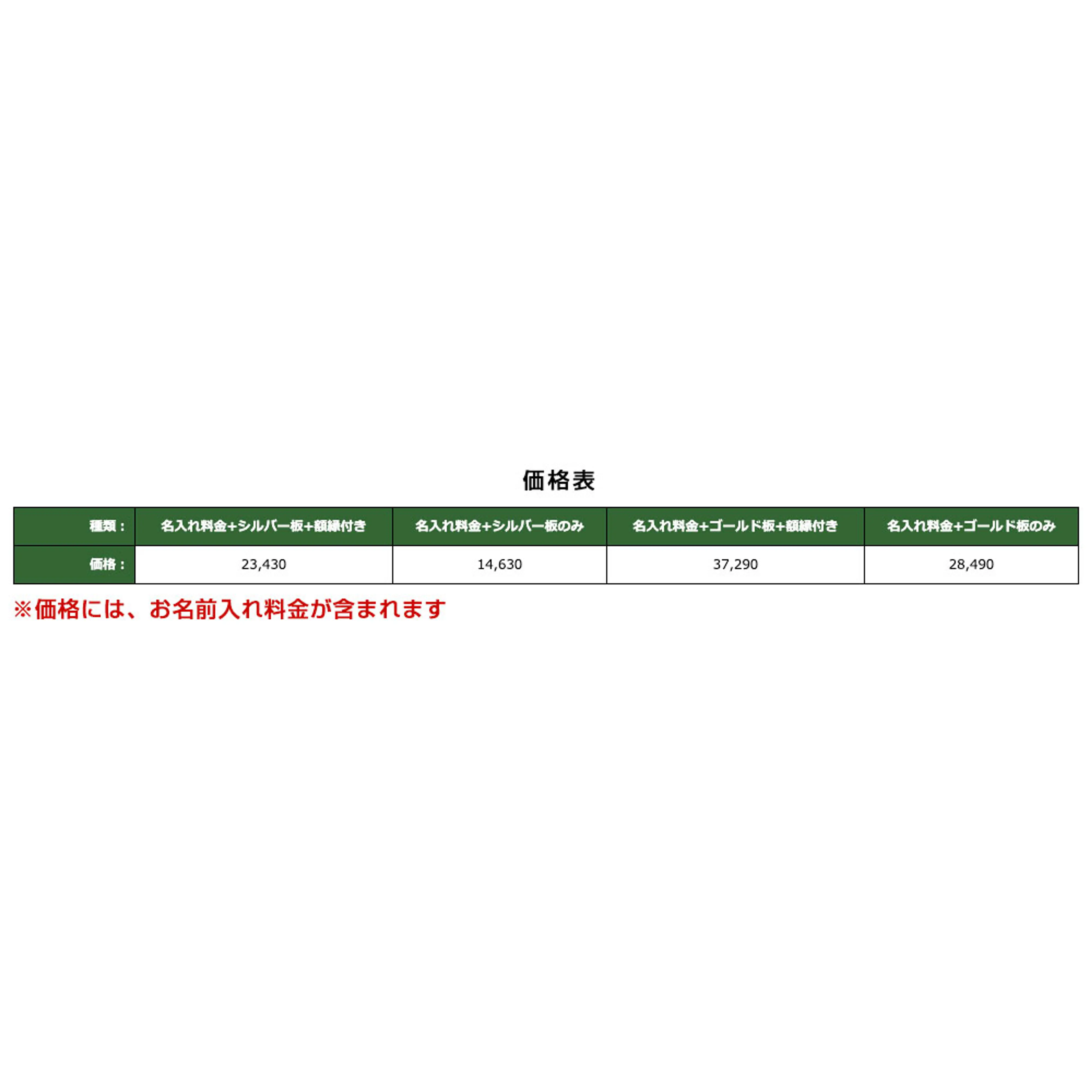 | 種類: | 名入れ料金+シルバー板+額縁付き | 名入れ料金+シルバー板のみ | 名入れ料金+ゴールド板+額縁付き | 名入れ料金+ゴールド板のみ |