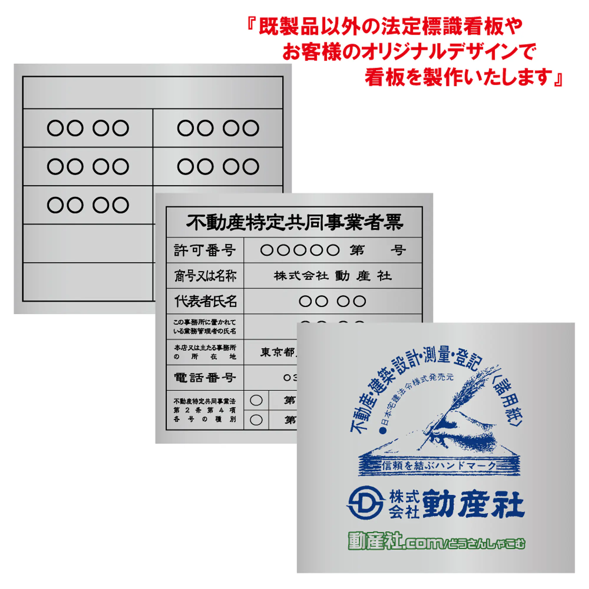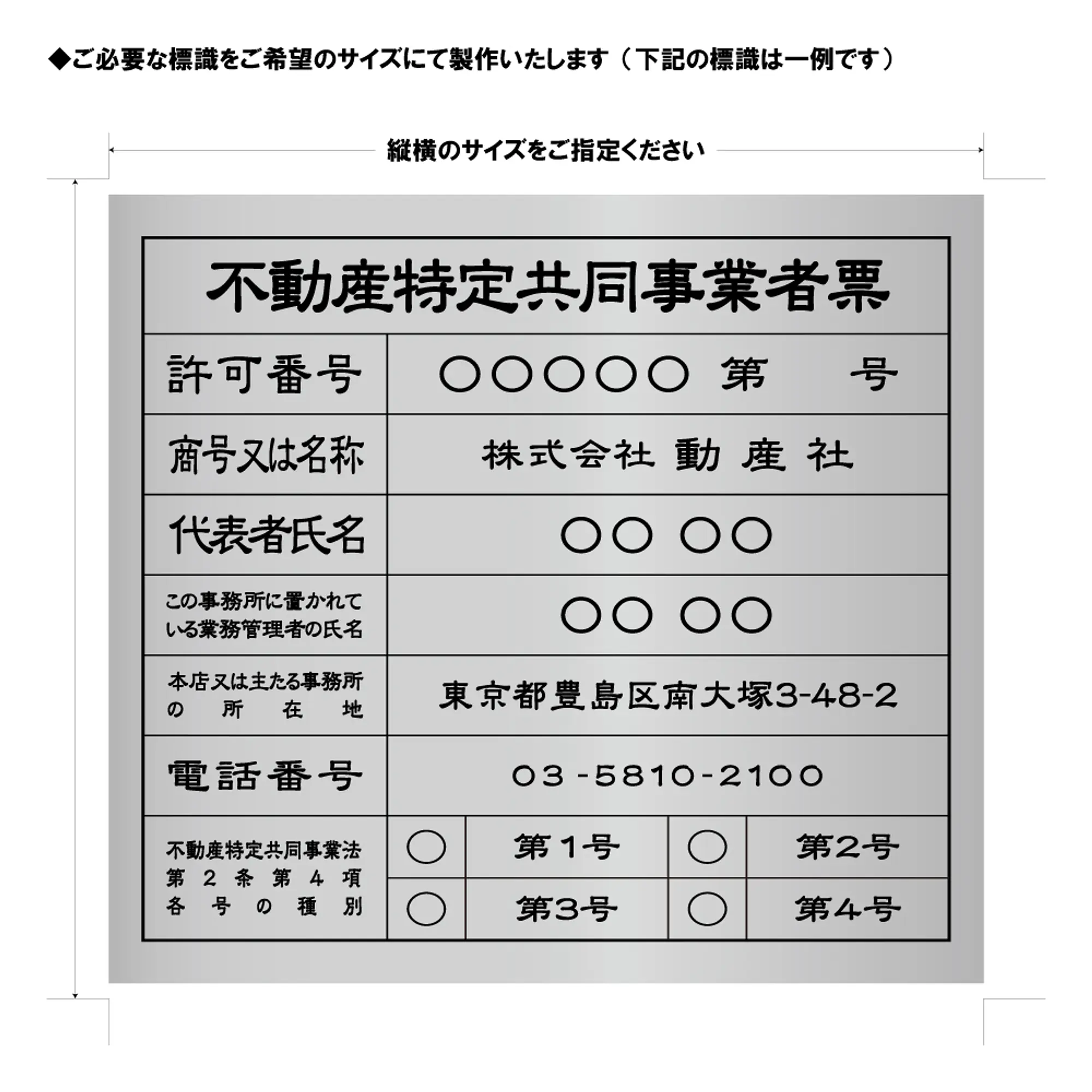 - 弊社既製品以外のサイズや既製品以外の法定標識もしくはオリジナルのデザインにて看板を製作いたします。