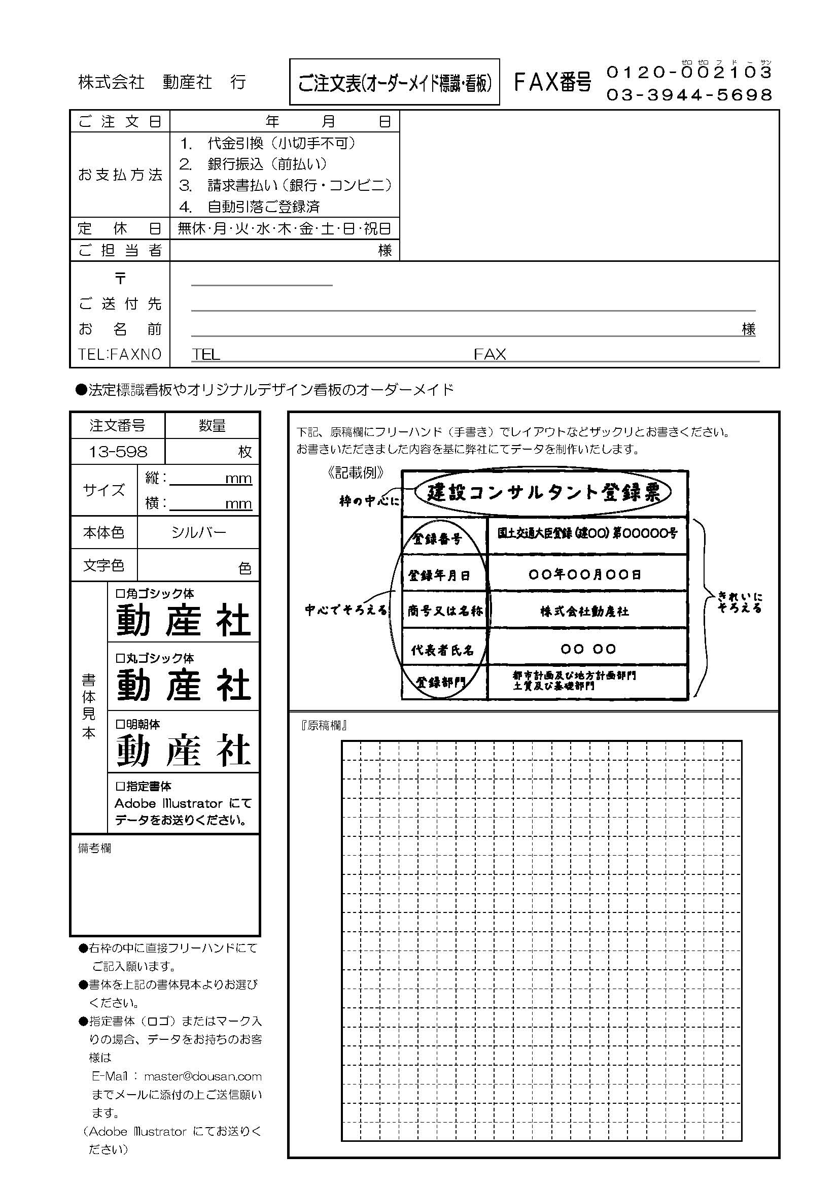 - Word・Excel・Pages・Adobe Illustrator・Photoshopなどで作成されたデータ(原稿)をmaster@dousan.comに添付の上お送りいただくか、下記のファクス注文フォームをご利用ください。