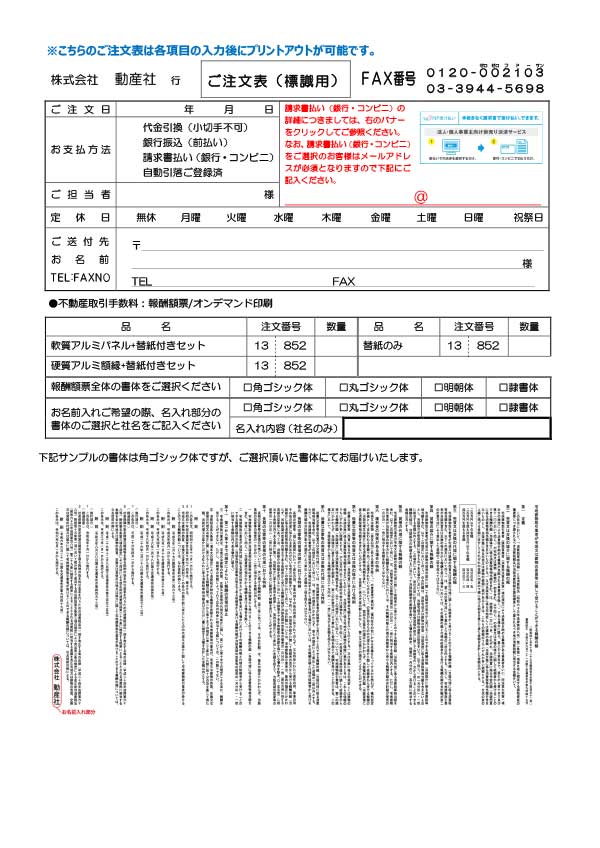 不動産取引手数料/報酬額票:オンデマンド印刷/標準サイズ