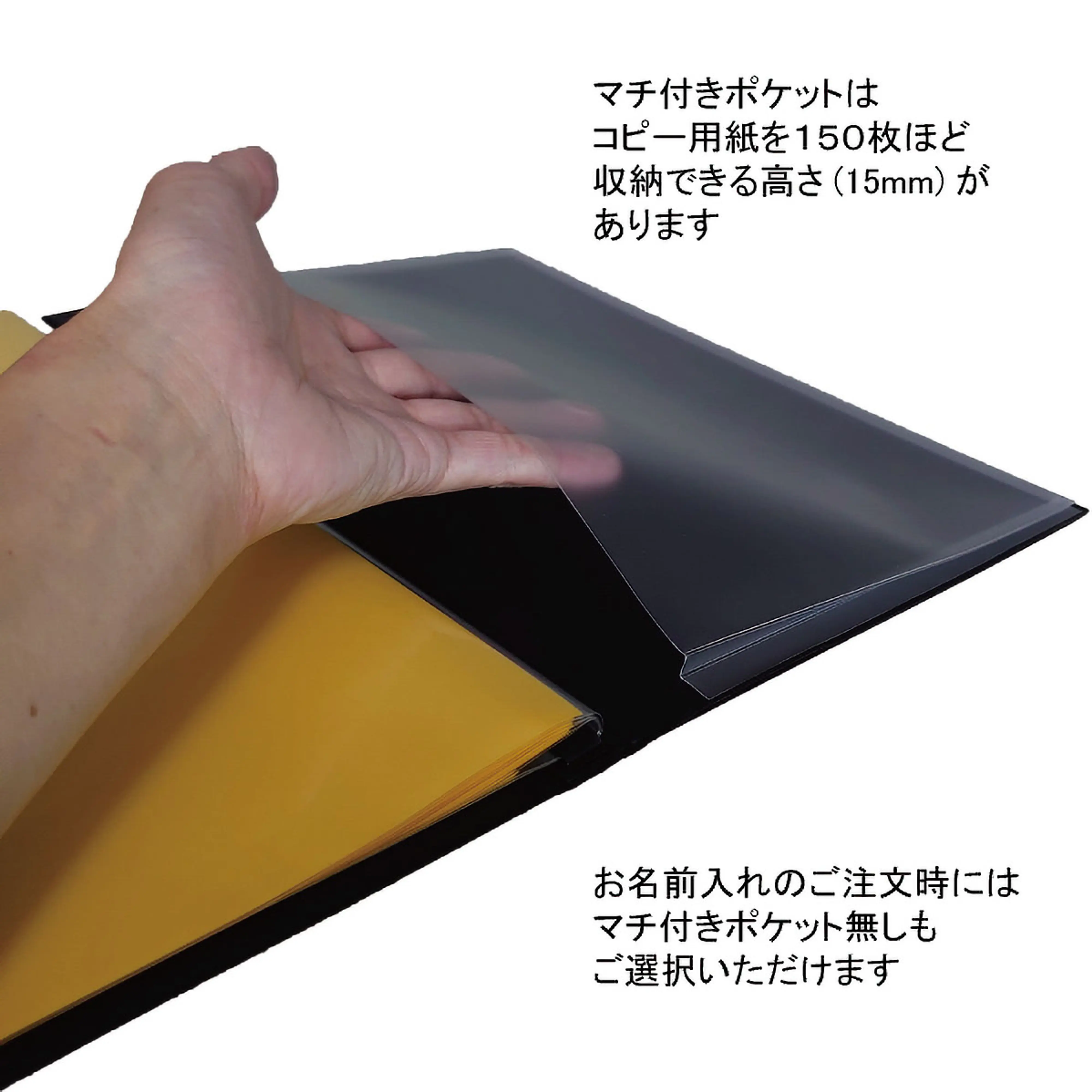ウラ表紙裏側にマチ付きポケット タテ320mm、ヨコ210mm、高さ15mmお名前入れのご注文時、マチ付きポケット無しの場合は本体価格より44円引きとなります。